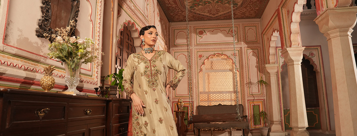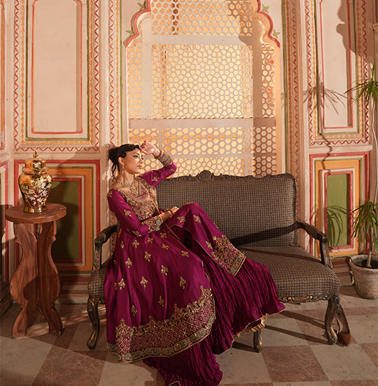 The stunning bridal dress features a skin-gold raw silk shirt adorned with intricate Resham work embellishments using Kora, Dabka, stones, and sequence. The bottom is crafted in jamawar with a bargundy color, adding a rich contrast to the overall design....